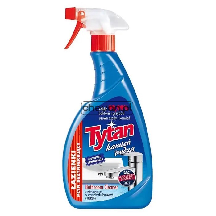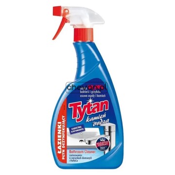 Płyn do mycia łazienek Tytan kamień i rdza skutecznie usuwa osady z kamienia, rdzy, mydła, zacieki wodne, tłuste plamy i inny brud. Przeznaczony jest do mycia powierzchni z chromu, stali nierdzewnej (zlewozmywaki kuchenne), glazury, umywalki, wanny, szkła