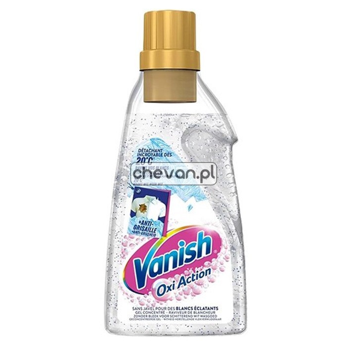 Vanish Oxi Action White odplamiacz do białych tkanin w żelu 750ml. NOWY WIELOFUNKCYJNY ŻEL bez dodatku chloru wzmacnia efekty prania i pomaga przedłużać życie białych ubrań