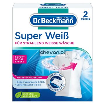 Saszetki Super Biel skutecznie rozjaśniają poszarzałe i pożółkłe tkaniny. Sprawiają, że ubrania stają się lśniąco białe jak pierwszego dnia. Ponadto Dr. Beckmann Super Biel chroni ubrania przed działaniem promieni słonecznych, skuteczny już przy 20 st.