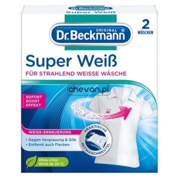 Saszetki Super Biel skutecznie rozjaśniają poszarzałe i pożółkłe tkaniny. Sprawiają, że ubrania stają się lśniąco białe jak pierwszego dnia. Ponadto Dr. Beckmann Super Biel chroni ubrania przed działaniem promieni słonecznych, skuteczny już przy 20 st.